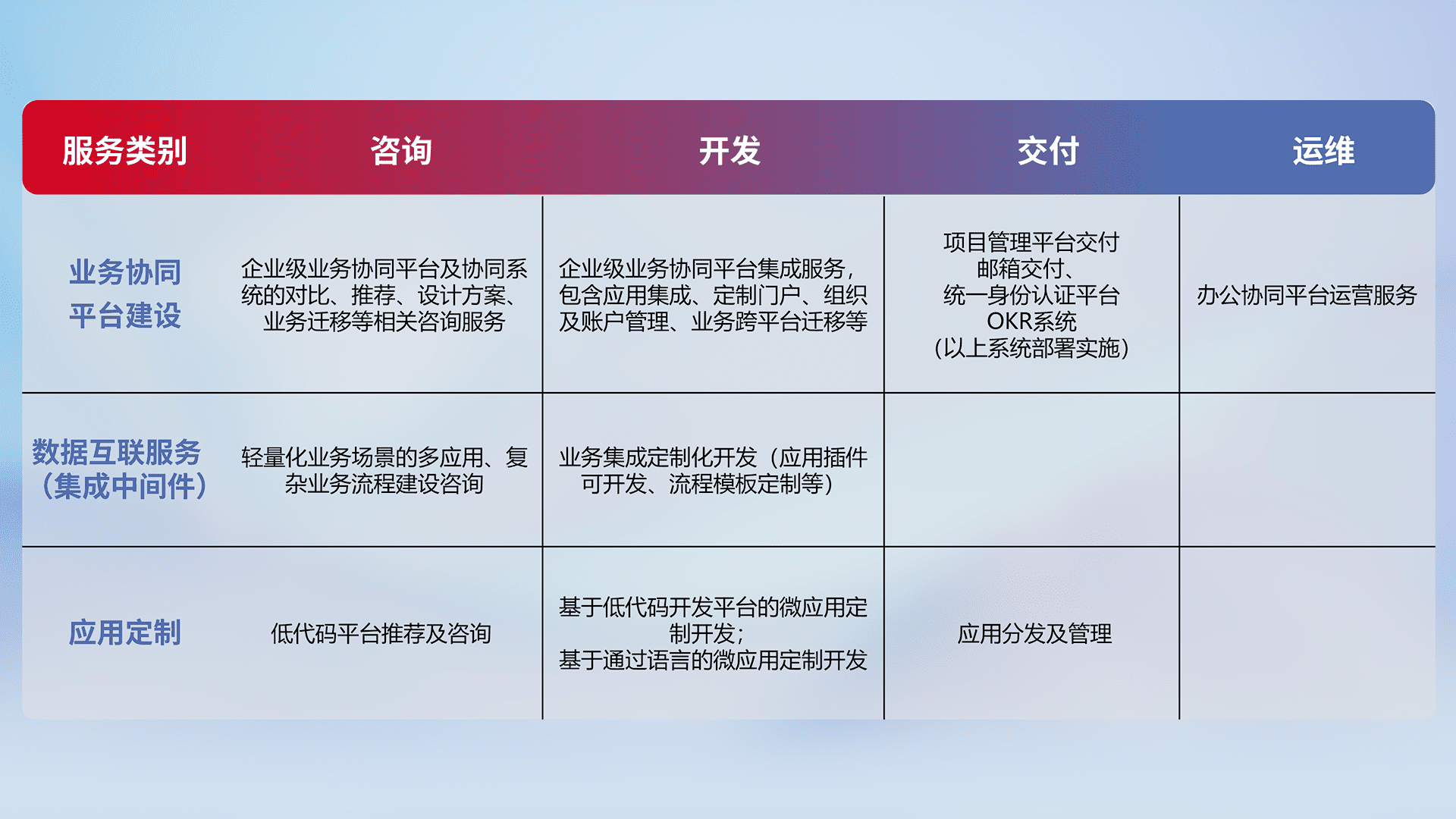 针对钉钉、、企微、、IDaas等平台级产品提供产品的规划、、、方案、、交付、、定制化开发等服务,,实现如统一协同办公、、、智能客户服务、、、、混合会议管理、、、、智能数据查询、、、、等业务场景,,实现数字化转型。。。