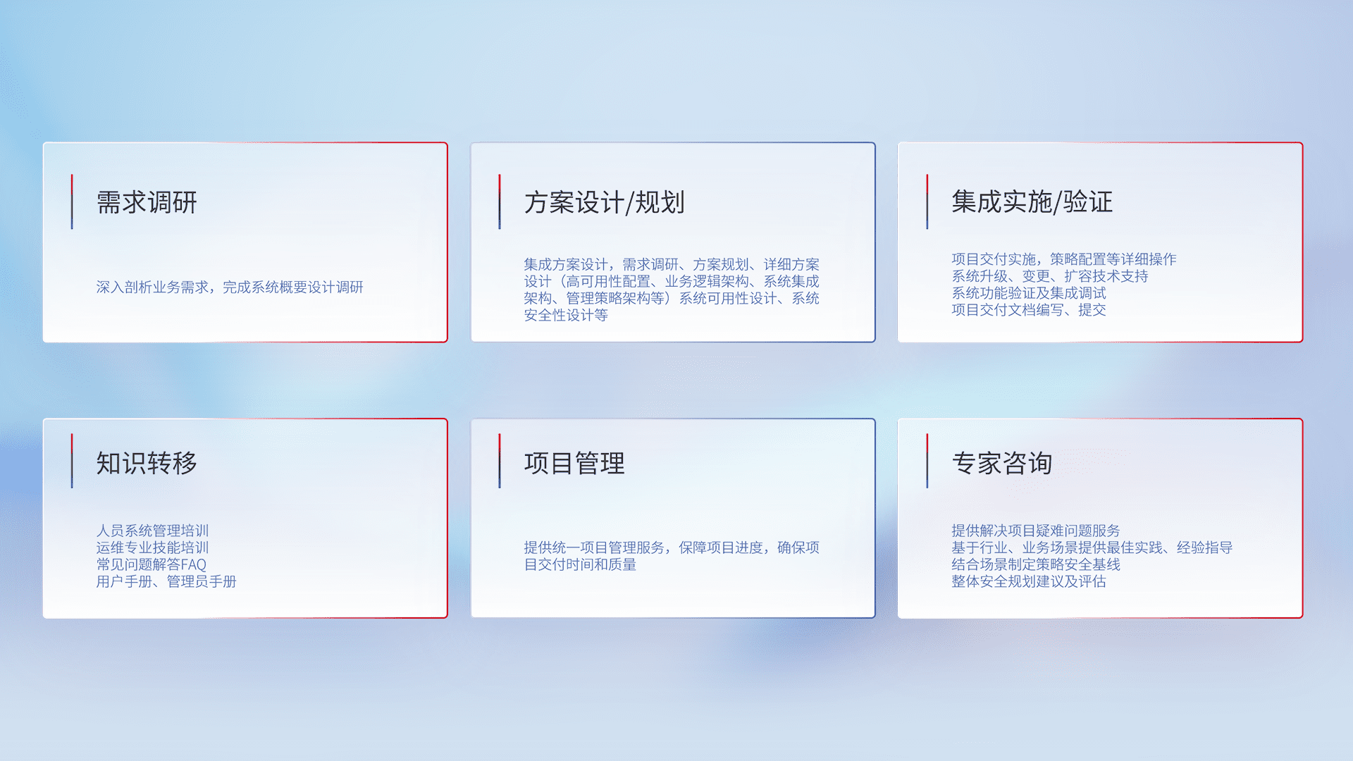针对客户行业特性,,,,将宏观的安全战略和需求,,,,通过专业的交付服务,,,,实现项目落地,,为客户提供标准规范的集成交付服务。。。。